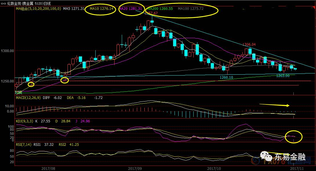 上方初步阻力在1272附近,隔夜金价失守1270后曾反弹至该位置,目前已经形成了初步阻力;然后是10日均线1276.14附近,100日均线也在该位置附近;重点关注20日均线1281.30附近阻力,该位置也是1257以来下行趋势线阻力位所在,若意外收复该位置,则缓解下行风险。(黄金日线图)