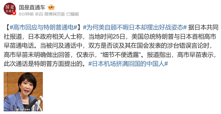 当时,高市早苗透露,在约10分钟的电话会谈中,她强调:“强化日美同盟是本届政府外交和安全领域的最重要事项。”