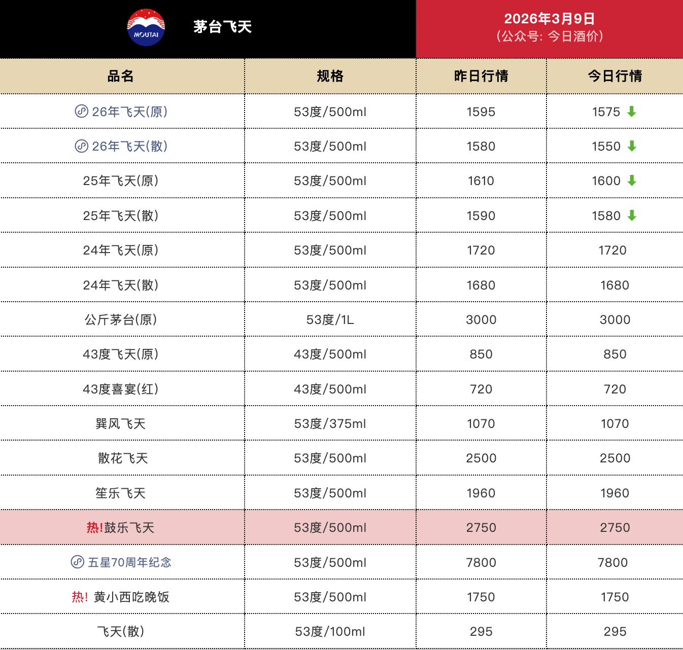 2026年3月9日 10淘金讯 “今日酒价”披露的批发参考价显示,3月9日,26年飞天茅台原箱较前一日下跌20元,报1575元/瓶;26年飞天茅台散瓶较前一日下跌30元,报1550元/瓶。25年飞天茅台原箱较前一日下跌10元,报1600元/瓶;25年飞天茅台散瓶较前一日下跌10元,报1580元/瓶。