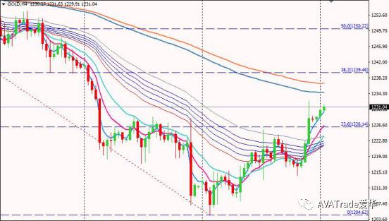 贵金属方面,黄金一举向上突破H4级别的重要趋势阻力,从H4图表观察,短期均线组几乎已经完成了对长期均线组的向上穿越,同时带动长期均线组快速趋向于粘合,同时正在转为上行。H4级别趋势正在发生改变,上方关注H4的EMA169附近的阻力。