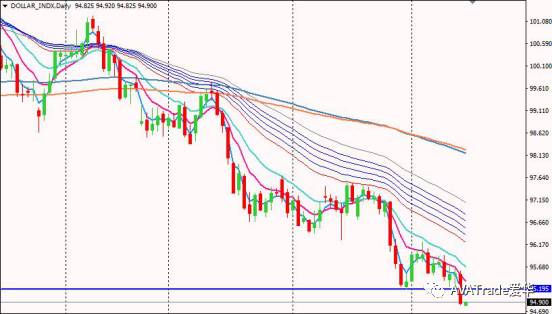 美元指数刷新年内低点,使得年内的下跌趋势进一步延续,从日线上观察,短期均线组与长期均线组均呈现较大发散幅度的空头排列,现实下跌趋势仍在发展过程中。在跌破95的重要心理价位后,关注短线是否出现震荡整理走势。