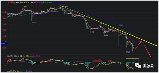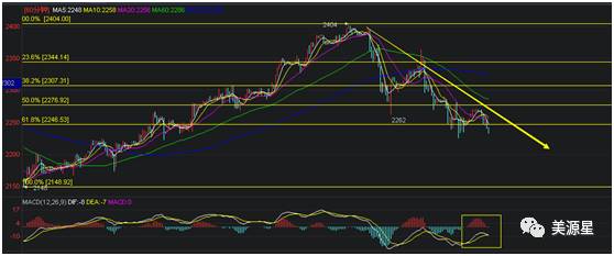 从一小时级别的图中可以看出,油价在最关键的一条黄金分割线附近震荡交投,但是上方有下降趋势线的压力,因此整体偏弱;MACD指标快慢线在0轴下方交叉向下,红色动量柱收短至0轴附近,技术偏空;操作上高抛低吸,逢高沽空为主。